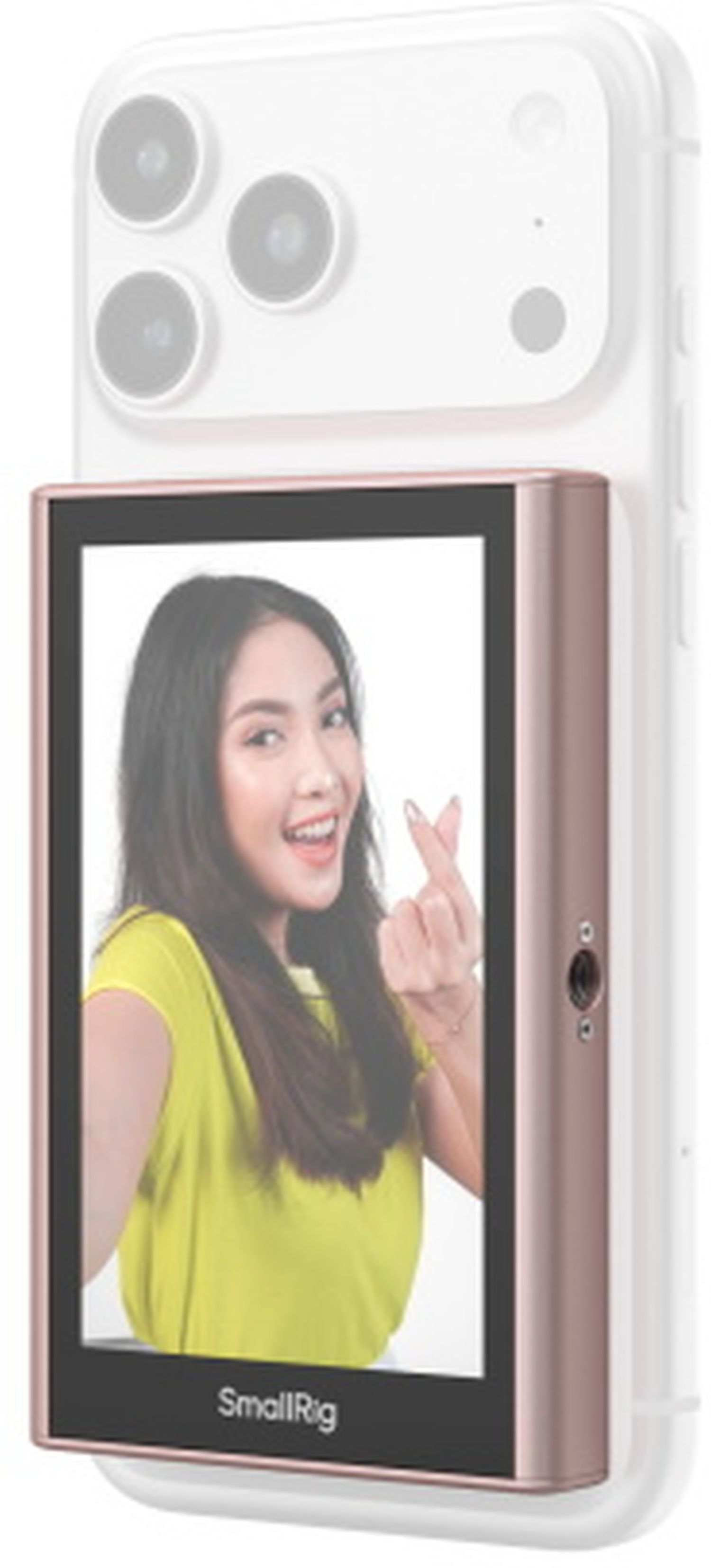 L'adaptateur d'affichage miroir sans fil SmallRig 5746 permet de transmettre sans fil l'image en direct de ton smartphone sur un écran externe. Idéal pour le vlogging, les selfies ou les enregistrements vidéo créatifs pour lesquels une surveillance flexible est nécessaire. Les images du produit montrent des accessoires optionnels et des exemples d'utilisation.