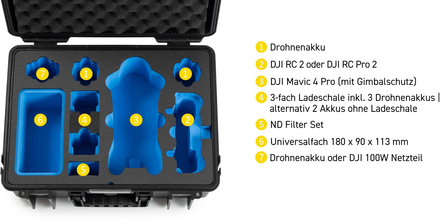 Mallette avec insert en mousse noir et bleu pour ton DJI Mavic 4 Pro et ses accessoires. Dans le couvercle, une poche en filet offre un espace de rangement supplémentaire - idéal pour les documents comme l'assurance du drone ou les petites pièces. Avec adaptateur en mousse pour une configuration flexible : place pour jusqu'à 7 batteries, y compris l'étui de chargement, ou alternativement 6 batteries sans étui de chargement.