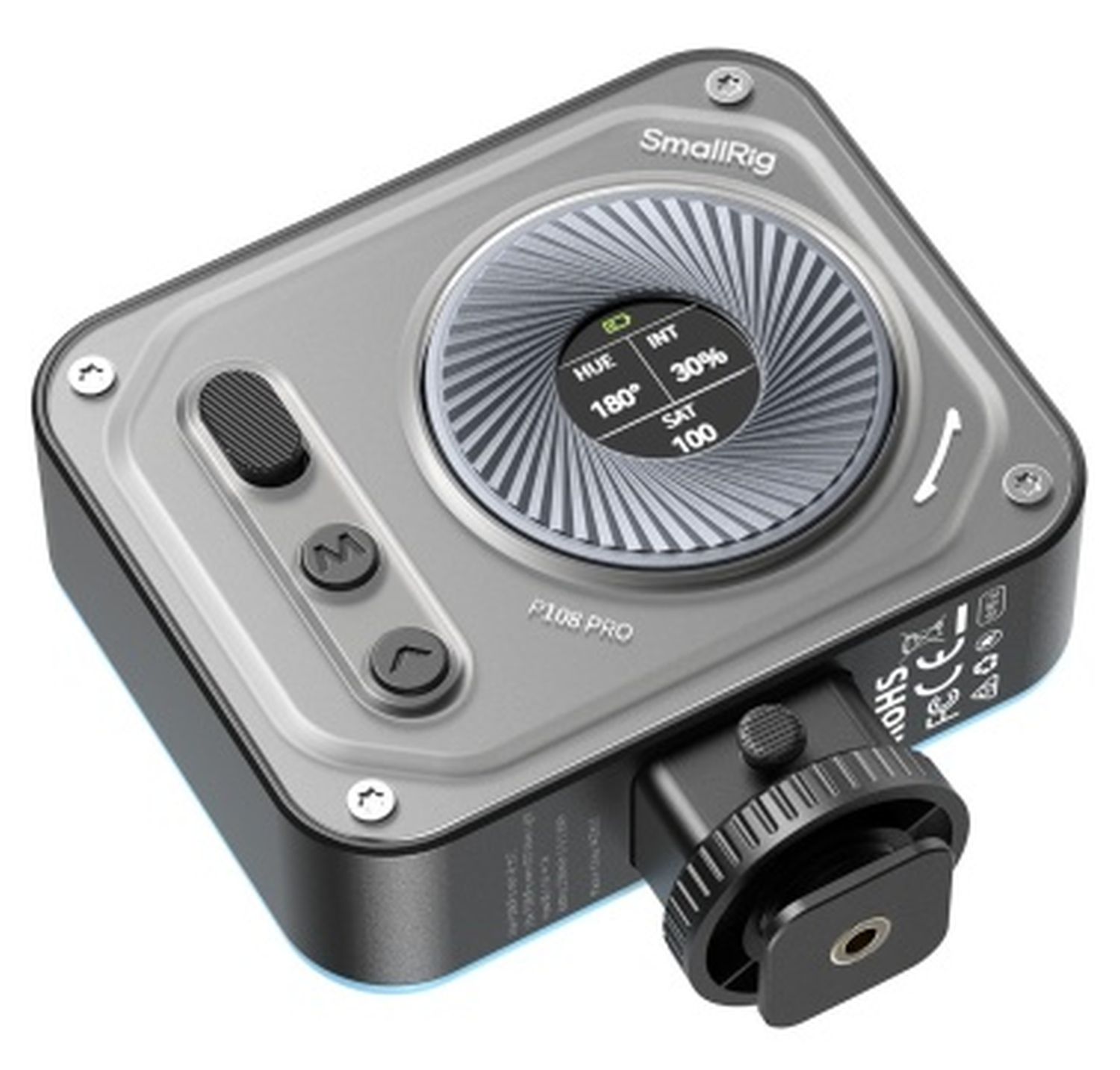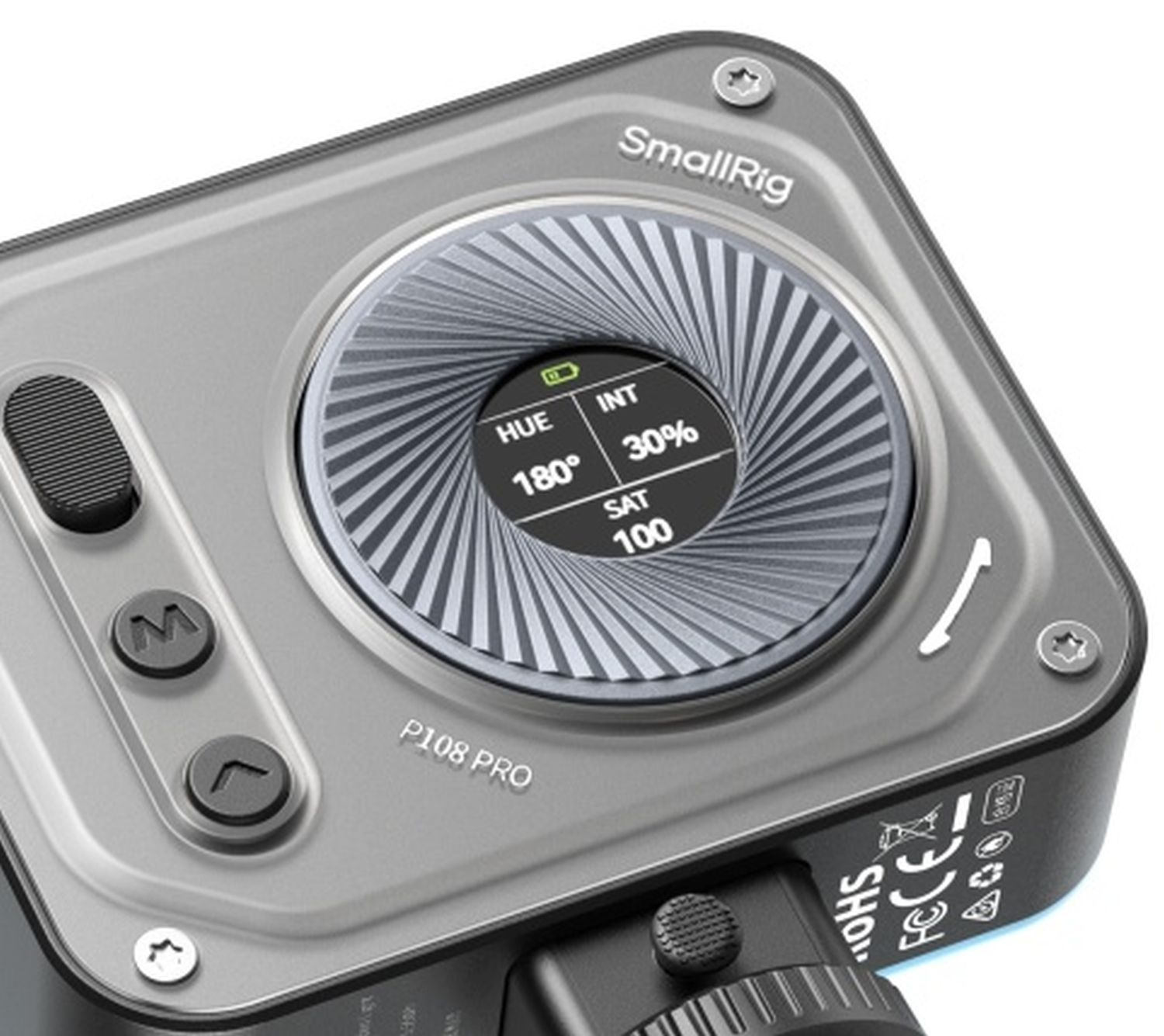 La SmallRig 4661 Vibe P108 Pro est une mini-LED RGBWW compacte d'une puissance de 5 W, CRI 95/TLCI 98 et jusqu'à 1160 Lux à 5600 K. Elle offre un panneau Softlight pour un éclairage uniforme, CCT 2500-6500 K, 12 effets spéciaux, une batterie USB-C (jusqu'à 3 heures) et de multiples options de montage - idéal pour les productions photo et vidéo.
